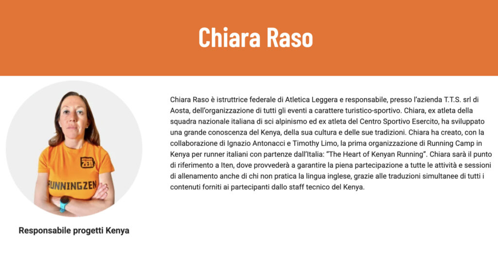 “The Heart of Kenyan Running” offre un supporto organizzativo e tecnico ai gruppi di runner che partiranno dall’Italia insieme a RunningZen, per consentire a tutti i partecipanti di vivere un’esperienza unica nel suo genere in un luogo magico per la corsa, il Kenya, dove sono nati i migliori maratoneti al mondo. Il viaggio sarà anche occasione di scoperta di popoli lontani e di condivisione dei tanti aspetti culturali legati non solo all’allenamento, ma anche allo stile di vita quotidiano.